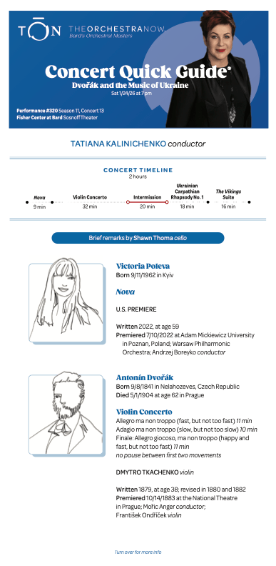 Ukrainian musicians Tatiana Kalinichenko—co-founder, music director, and conductor of the New Era Orchestra in Kyiv—and violinist Dmytro Tkachenko—winner of the Carl Nielsen, Lysenko, and Wronski Solo Violin Competitions—bring their artistry to the Fisher Center for a one-night-only concert with TŌN. Tkachenko performs Dvořák’s elaborate and lyrical Violin Concerto, which includes a uniquely Czech finale featuring two popular folk dances. Kalinichenko also shares music by three Ukrainian composers with Fisher Center audiences: Levko Kolodub’s luxurious Ukrainian Carpathian Rhapsody No. 1; the U.S. premiere of Yevhen Stankovych’s expressive suite of music from his ballet The Vikings; and the U.S. premiere of Victoria Poleva’s powerful and triumphant 2022 composition Nova, a salute to the courage of the Ukrainian people.