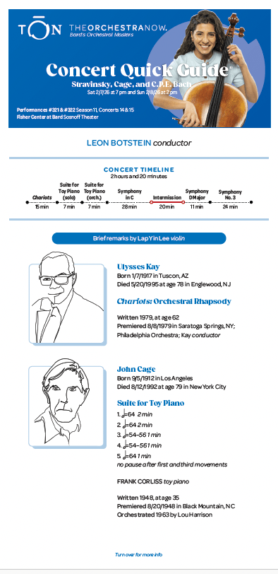 Leon Botstein leads TŌN in a concert of music spanning over 200 years, with four 20th-century works presented alongside a brief symphony from 1776. The program begins with Ulysses Kay’s Chariots, inspired by the writings of poet William Blake and others, and John Cage’s whimsical Suite for Toy Piano, both in solo performance by Frank Corliss and Lou Harrison’s orchestration. Then we explore three symphonies of different styles: Stravinsky’s expressive Symphony in C; C. P. E. Bach’s adventurous Symphony in D Major, and one of Albert Roussel’s most beloved works, the vivacious Third Symphony, written for the 50th anniversary of the Boston Symphony Orchestra in 1930.